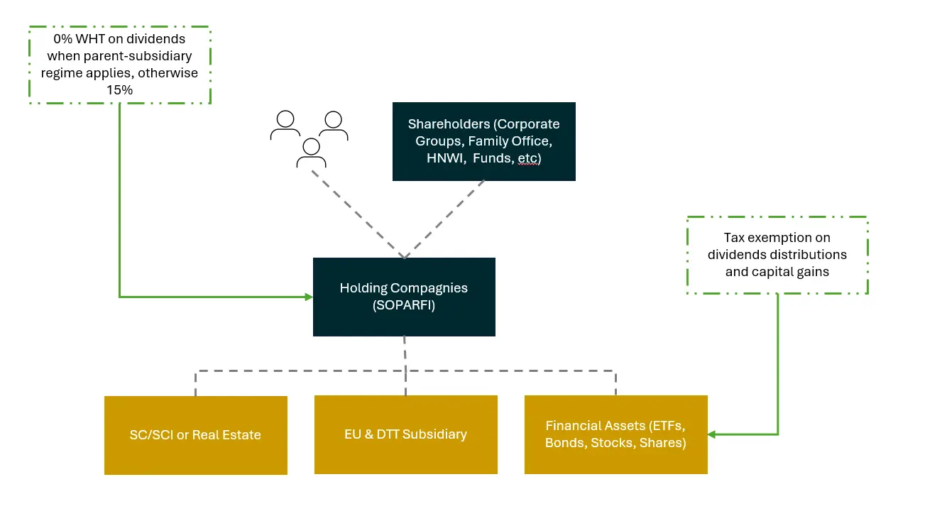 This structure is designed to help you reinvest profits efficiently within your group or repatriate earnings to shareholders without losing value to double taxation. It turns Luxembourg into a powerful platform for managing international investments, acquisitions, and group financing while keeping administrative requirements simple and predictable.